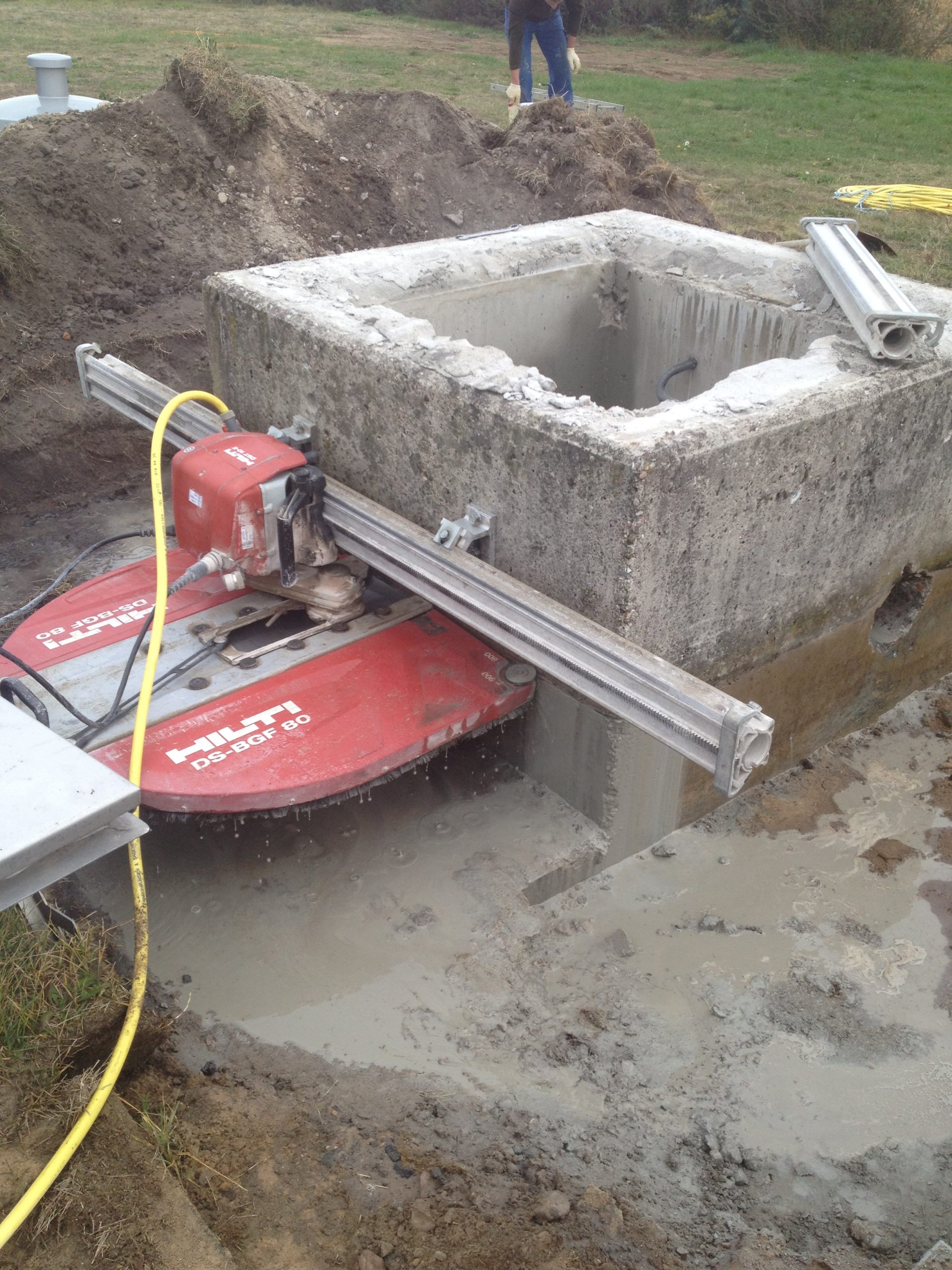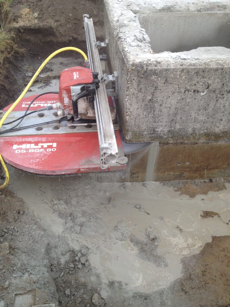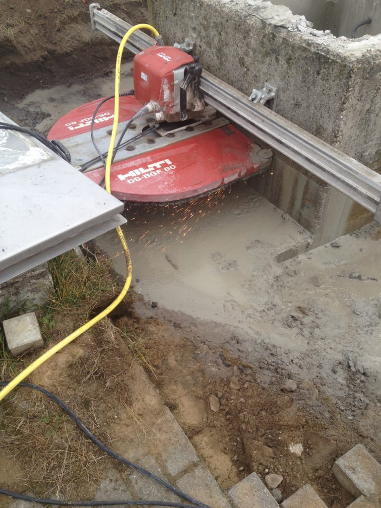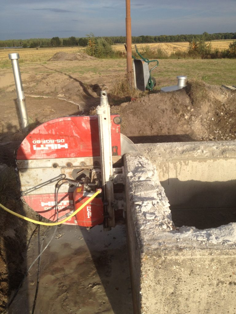 Betonschacht kürzen Flacher ist schöner: In Schwante hat unser Team einen Betonschaft mit einer Säge durch horizontale und vertikale Schnitte gekürzt. Die Betonstücke wurden dann entnommen und entsorgt.